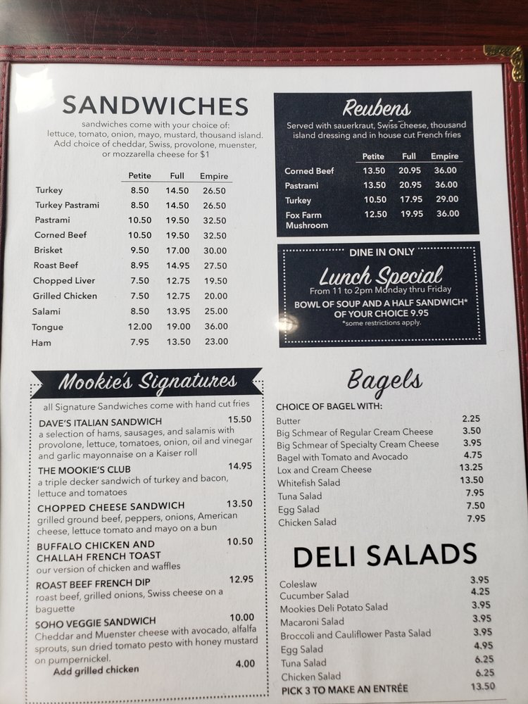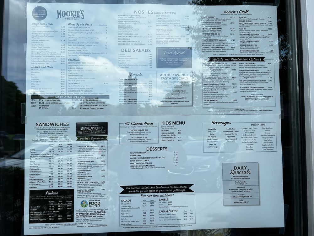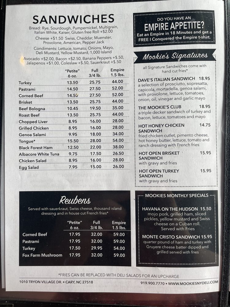 Mookie's New York Deli, located in Cary, NC, offers a charming deli experience with a bar flair. The menu boasts a variety of classic deli sandwiches in different sizes, accompanied by generous portions of hand-cut fries. Customers rave about the Upper West Side Egg Rolls and the signature Rueben sandwich. The friendly and efficient service, along with the cozy atmosphere, make dining at Mookie's a pleasant experience. With options for delivery, takeout, and catering, this deli is a gem for sandwich lovers in the area. The spotlessly clean setting, fresh fries, and outstanding sandwiches keep customers coming back for more. Next time you're in the mood for a satisfying deli meal, Mookie's New York Deli is a must-visit spot.